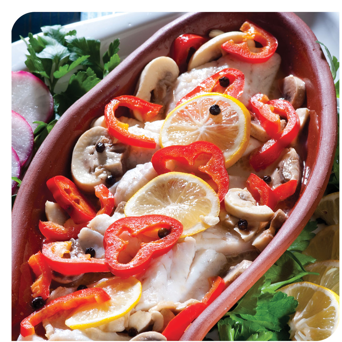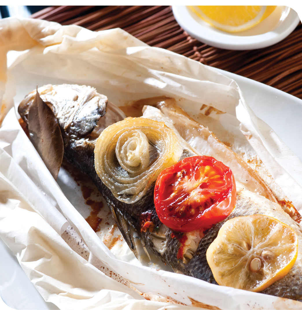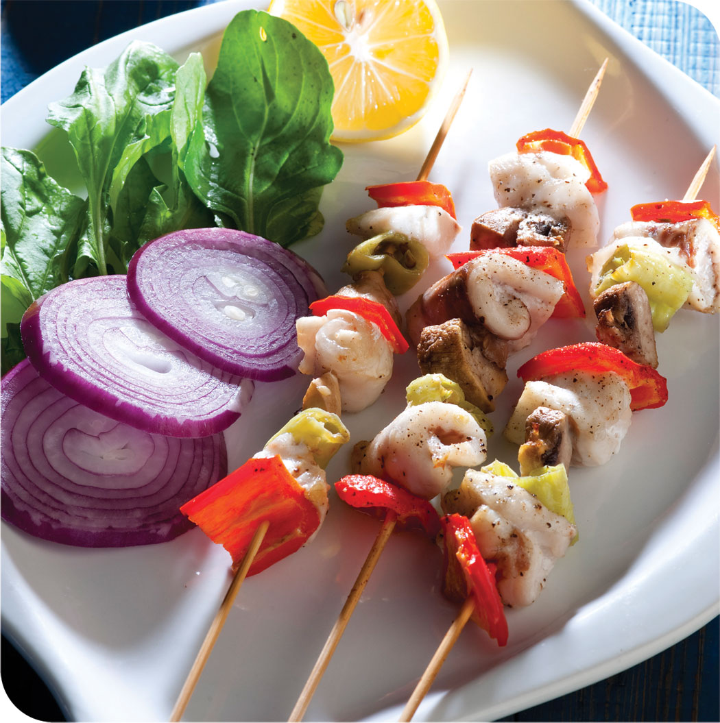 - Spit the materials on the shish sticks in the order of one piece of red pepper, one piece of mushrooms, one piece of bass and one piece of Italian pepper. Lay a wax paper into the oven tray and arrange the shish sticks on this. Cook them in the heated oven for 10 to 12 minutes and serve it hot with the onion, lemon and greens.